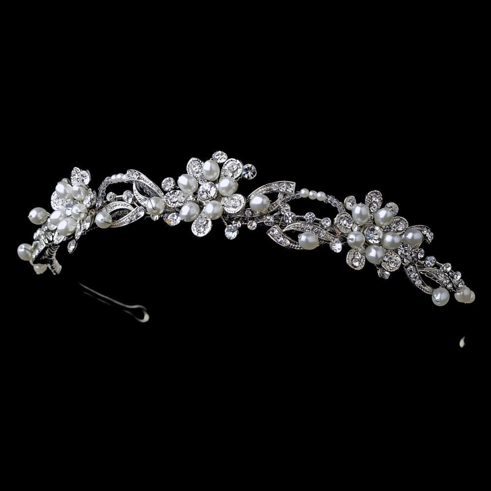This captivating antique silver headpiece features a divine symphony of gorgeous adornments. Lustrous ivory faux pearls, sprigs of radiant clear crystals and delightful antique silver plated flowers embellished with sparkling clear crystals. This piece would look stunning on any classic or vintage inspired bride with a white or ivory wedding dress.